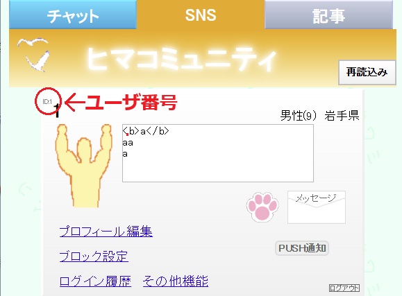 ・ヒマコミュを押さずに直接「https://himachat.jp?user=ユーザ番号」でURLを入力する事も可能です。