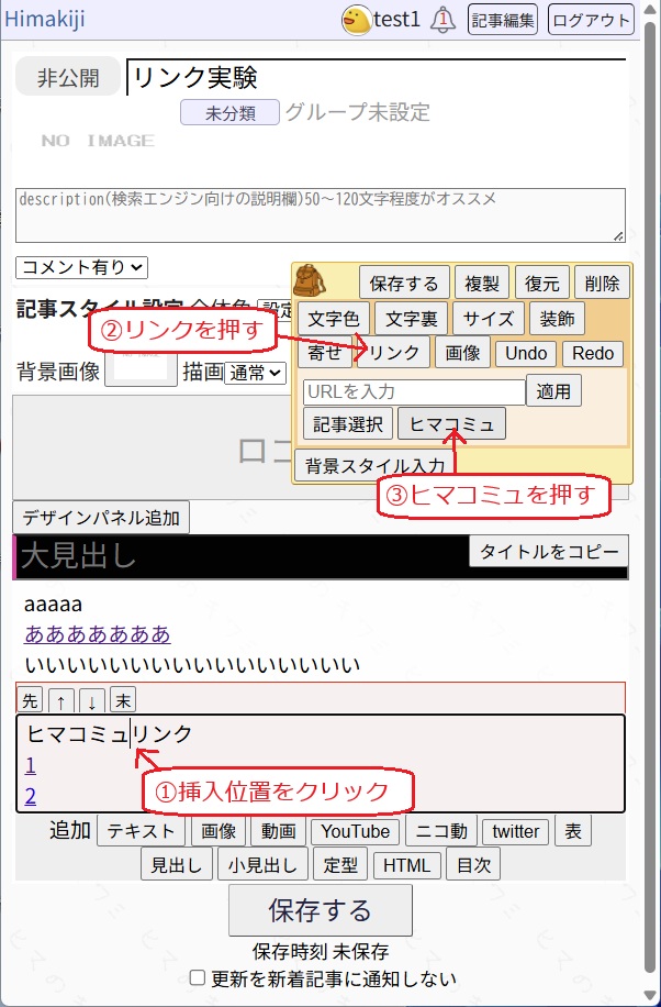 2.記事の中のリンクを挿入したい位置にカーソルを合わせて「リンク」を押し、「ヒマコミュ」を押してください。
