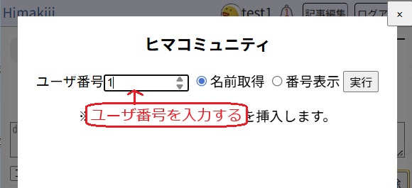 3.リンクしたいユーザ番号を入力して「実行」を押します。自動的に名前を取得してタグを生成します。数字表記にしたい場合は「番号表示」を選択してください。