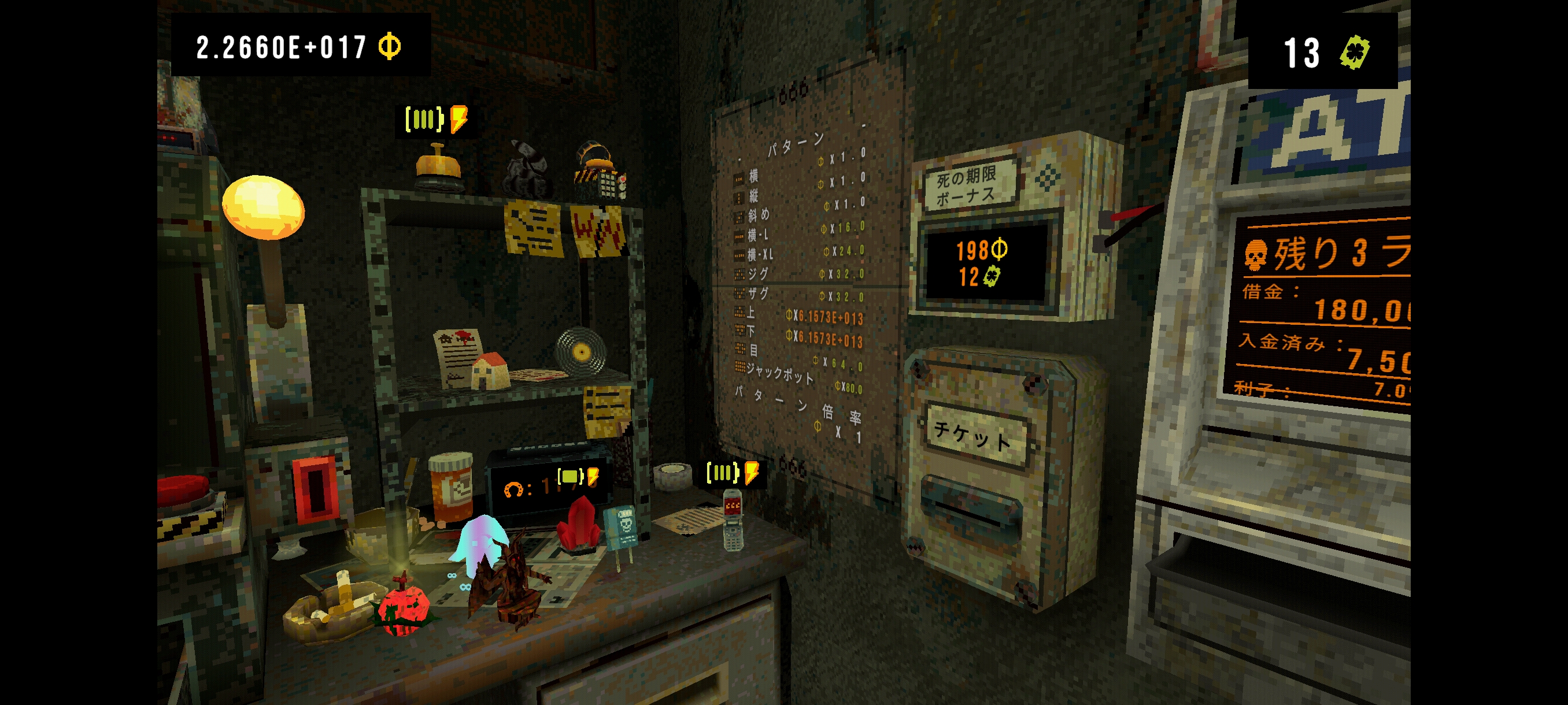 死の期限はクリアすると借金が跳ね上がって新たな死の期限が開始され、これは無限に繰り返される他、死の期限をクリアするほど徐々に増加量自体も上がっていき、所謂指数関数的に上昇してゆく。死の期限をクリアし続けるにはただスロットを回すだけでは到底足りない。そこで必要になるのがラッキーチャーム。