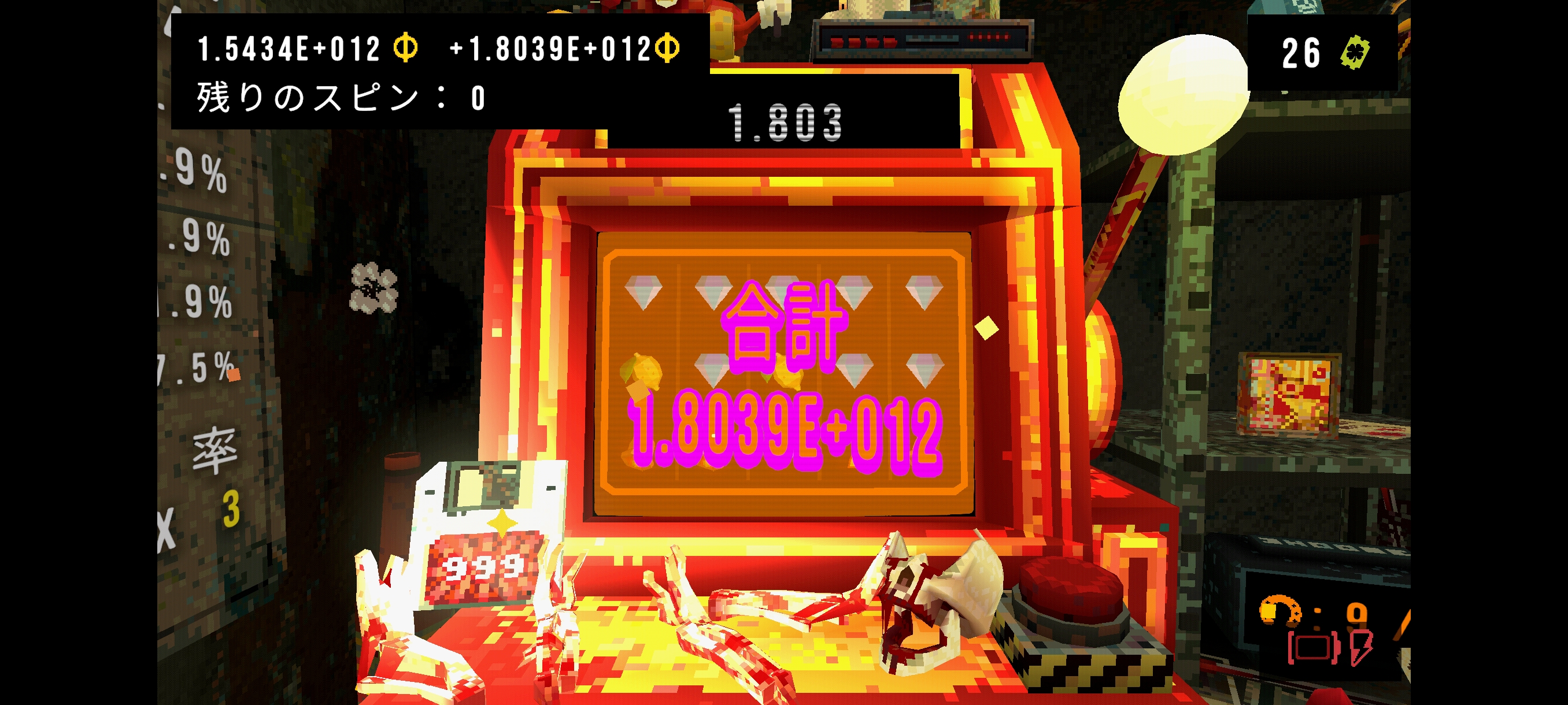 合計1.8039E+012と、表記が指数表記になっている。恐らく21億以上の数字を扱うためだろう。正直なところCloverPitの脱出には死の期限#8のノルマと死体4つとスカルの副作用による 死の期限ノルマ+25%の値である250000コイン稼げば大丈夫でありここまで稼ぐ必要はない。いわゆるオーバーキルである。