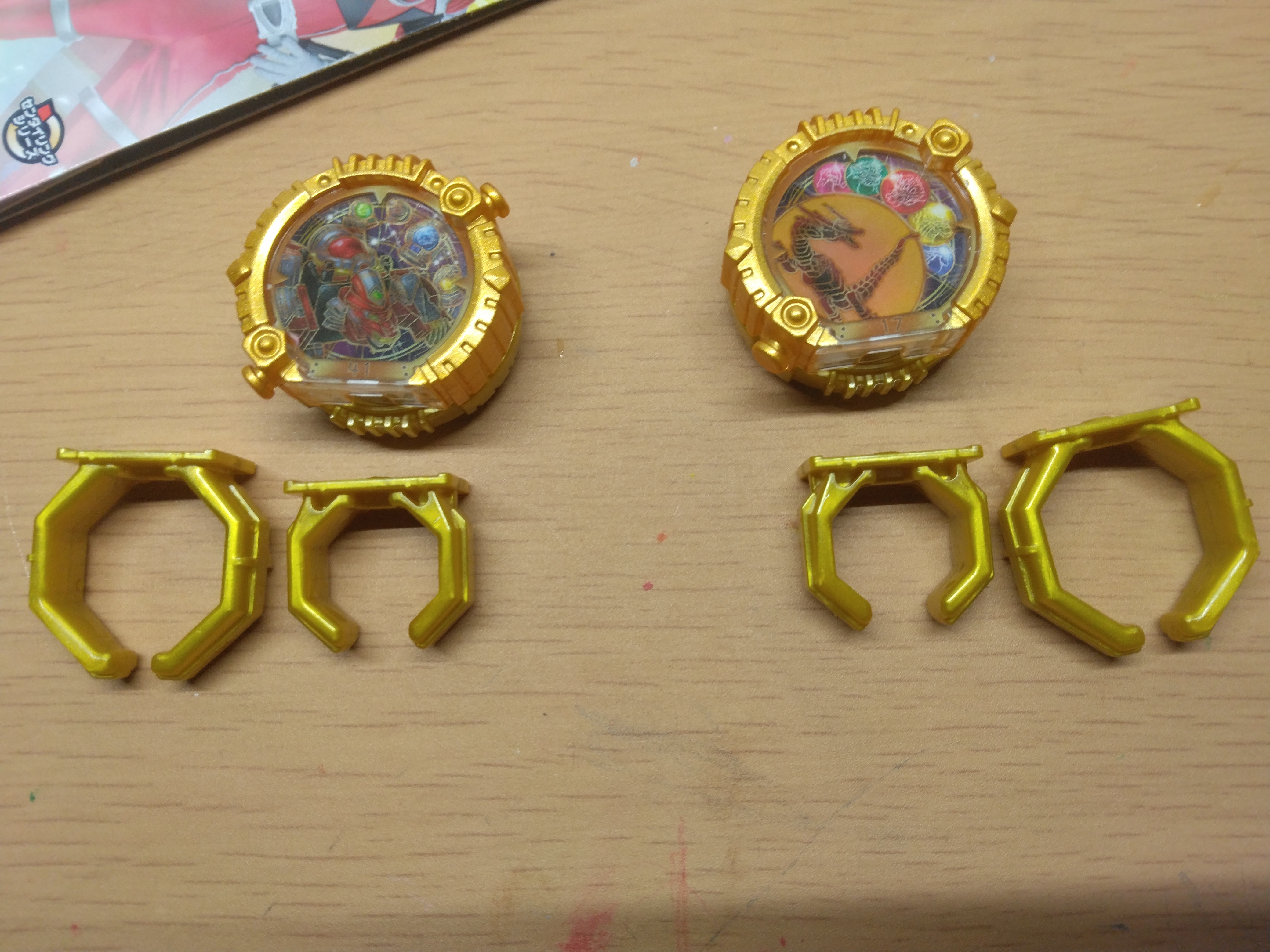 いつも通り、中身は本体とリングパーツが大小1つずつ付属している。以前買ったポーラーリングのセットはデザインの方向性が統一されていたが、通常の指輪はそれぞれ固有のデザインになっている。ちなみにこのセットの回転しない部分はどちらも「レッドの合体メカ」という点が共通し、さらに戦隊同士のモチーフも「星」や「宇宙」にまつわるものという点で少し似ている(作風はかなり違うが)。